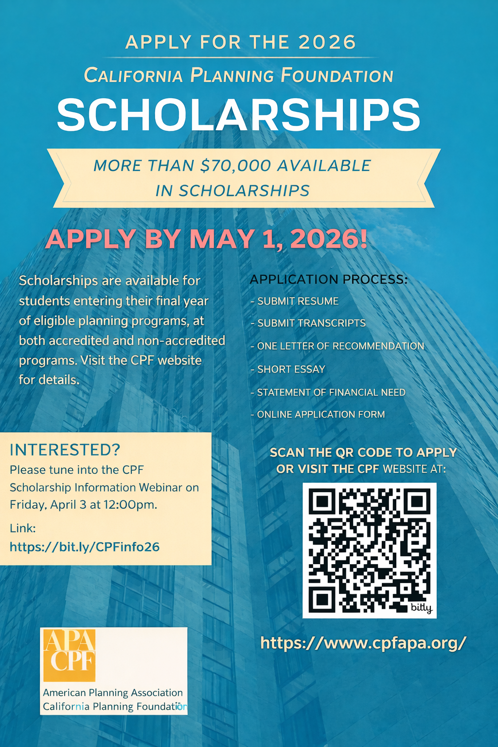 The California Planning Foundation (CPF) scholarship process is open and available for students to start their applications. CPF scholarship program awards scholarships to outstanding planning students enrolled at eligible professional planning degree programs in California, and seeking to enter the planning profession based on an application and selection process. Criteria for the scholarships include academic performance, financial need, increasing diversity in the planning profession, and a commitment to serve the planning profession in California after graduation.