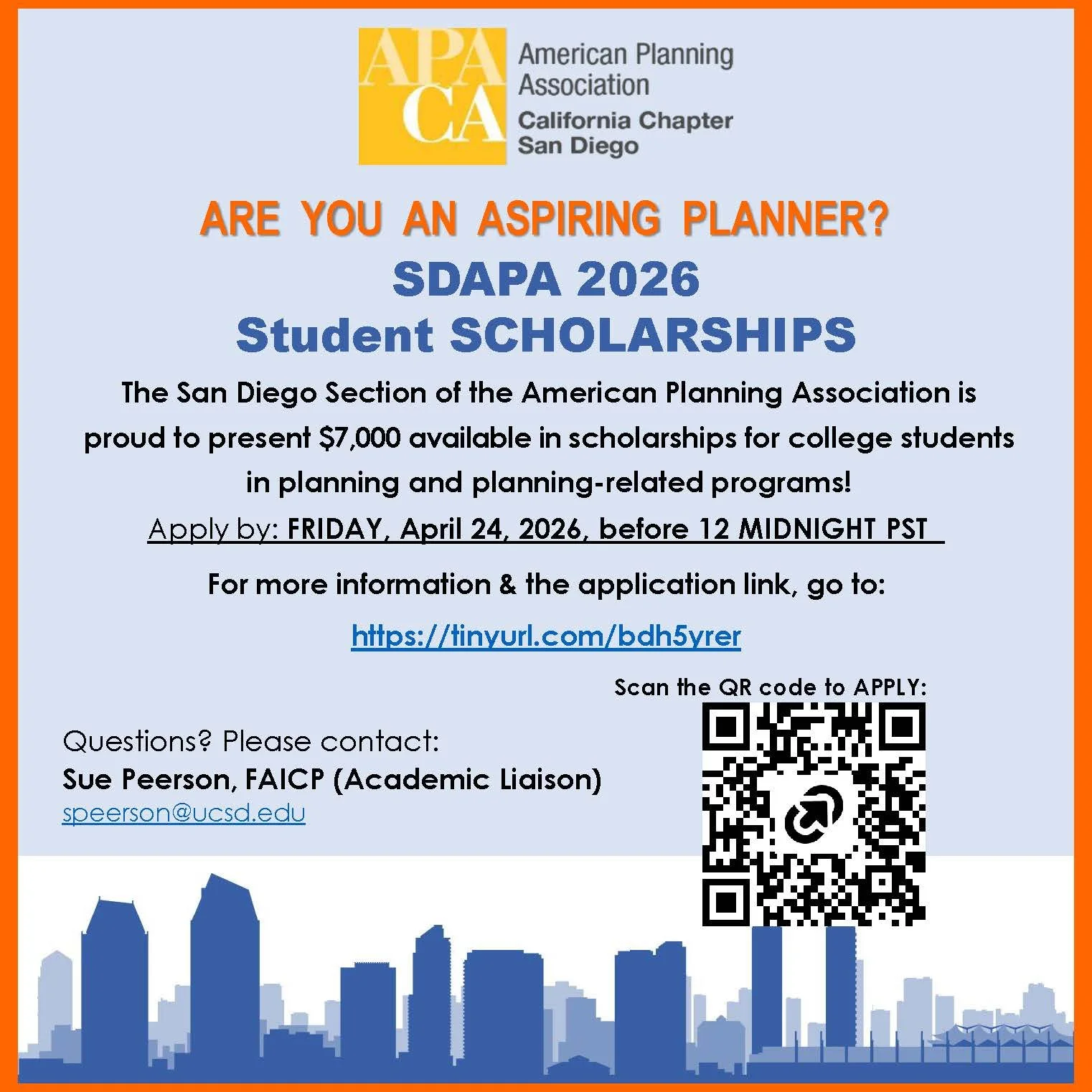 If you have any questions, please email: speerson@ucsd.edu, Sue Peerson, FAICP (SDAPA Academic Liaison).